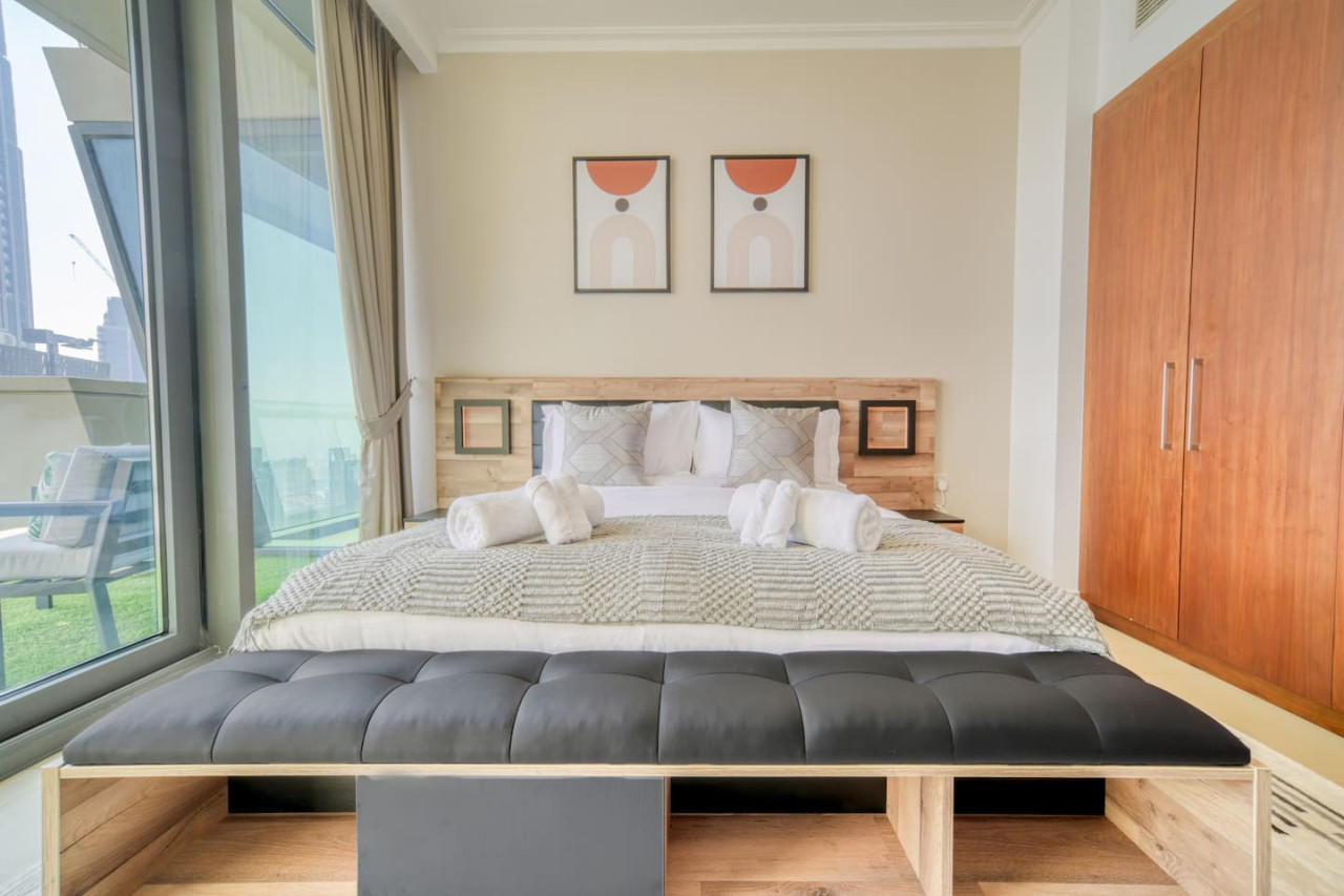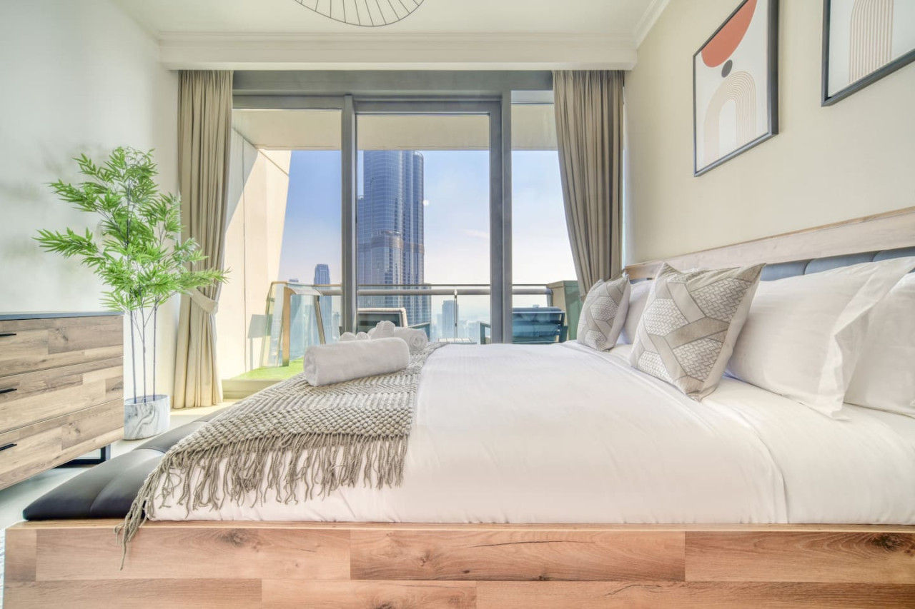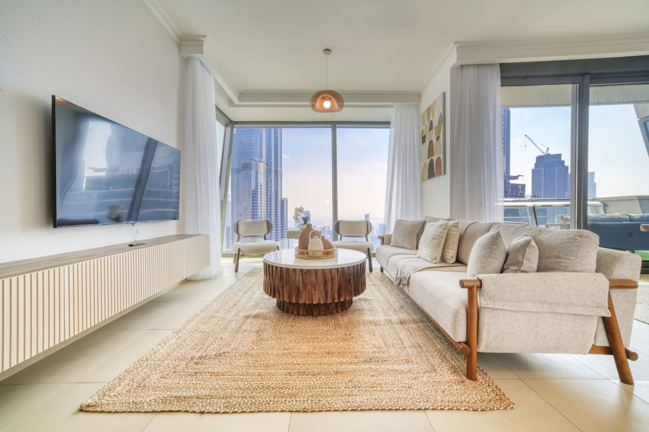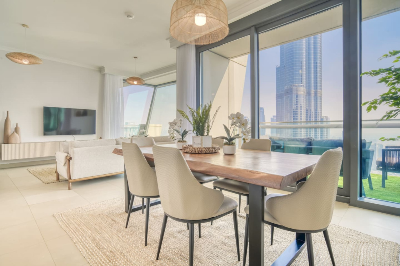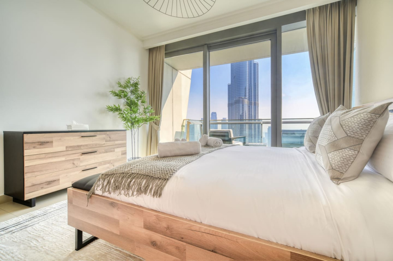 Step into a bohemian-inspired sanctuary in the heart of Downtown Dubai. This spacious three-bedroom plus maid’s room residence at Burj Vista offers breathtaking, uninterrupted views of the Burj Khalifa and The Dubai Fountain from every bedroom, creating a truly unique living experience. The interiors are thoughtfully designed with a modern bohemian theme, blending natural textures, warm earthy tones, and chic artisanal details. An open-plan living and dining area flows seamlessly onto a generous balcony, where you can enjoy panoramic cityscapes and evening fountain shows. Each bedroom features floor-to-ceiling windows, letting in abundant natural light and framing the skyline’s most iconic landmarks. The master suite includes a luxurious en-suite bathroom and ample wardrobe space, while the maid’s room adds practical flexibility for family or staff. Residents of Burj Vista enjoy world-class amenities, including a swimming pool, fully equipped gym, landscaped gardens, children’s play areas, and direct air-conditioned access to The Dubai Mall and Metro. Whether as a stylish family home or an exceptional investment in Dubai’s most prestigious address, this apartment captures the perfect balance of comfort, creativity, and unrivaled views.