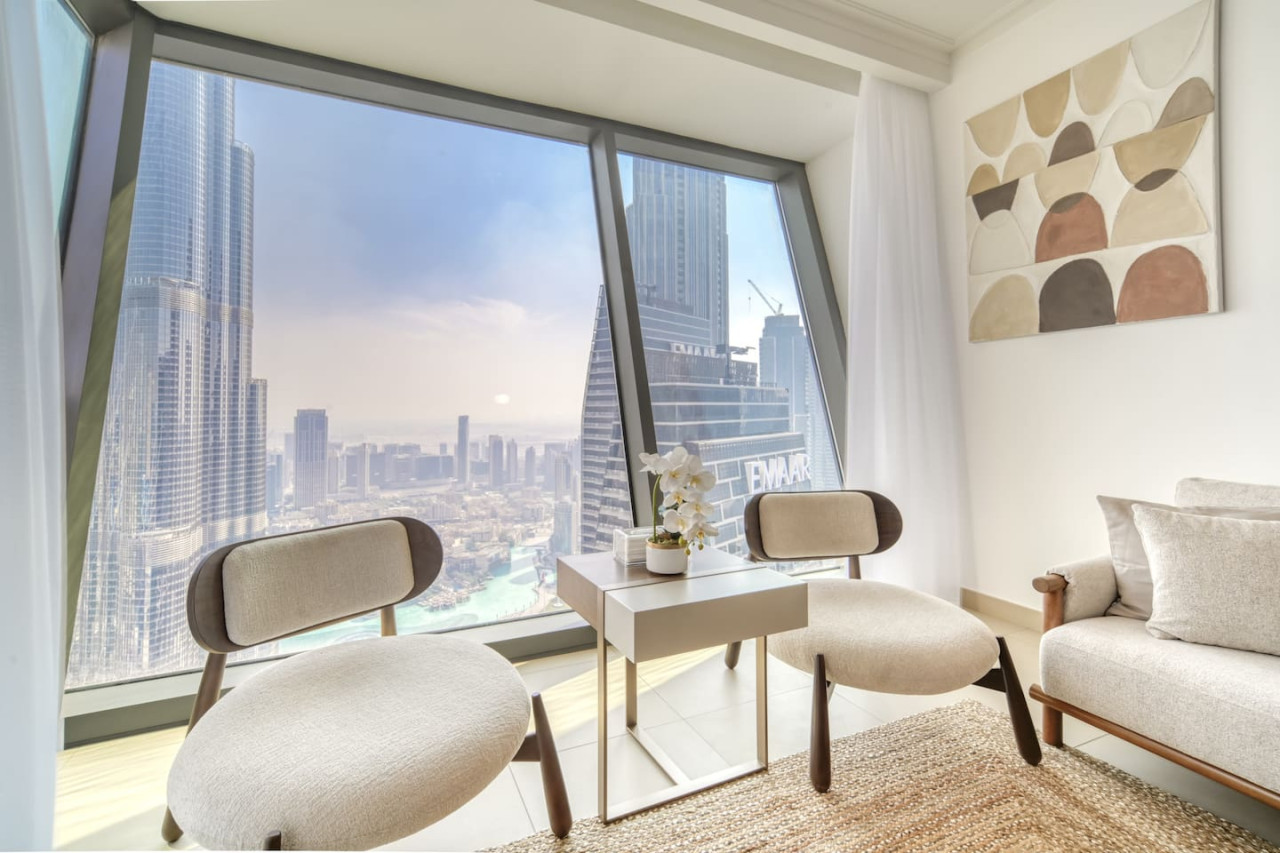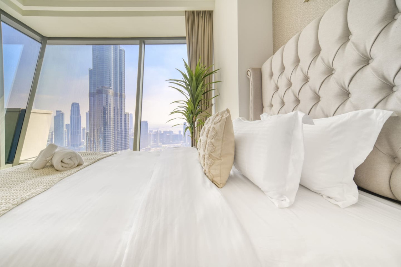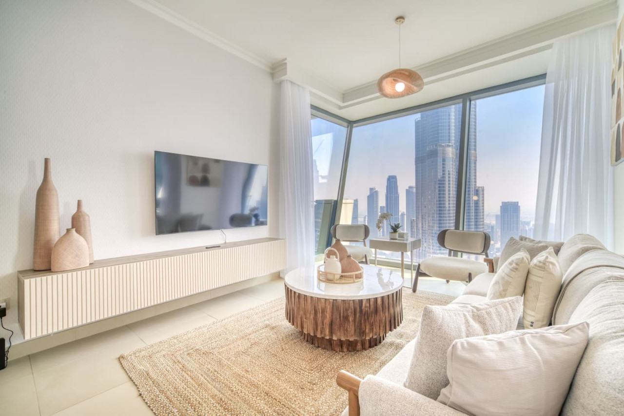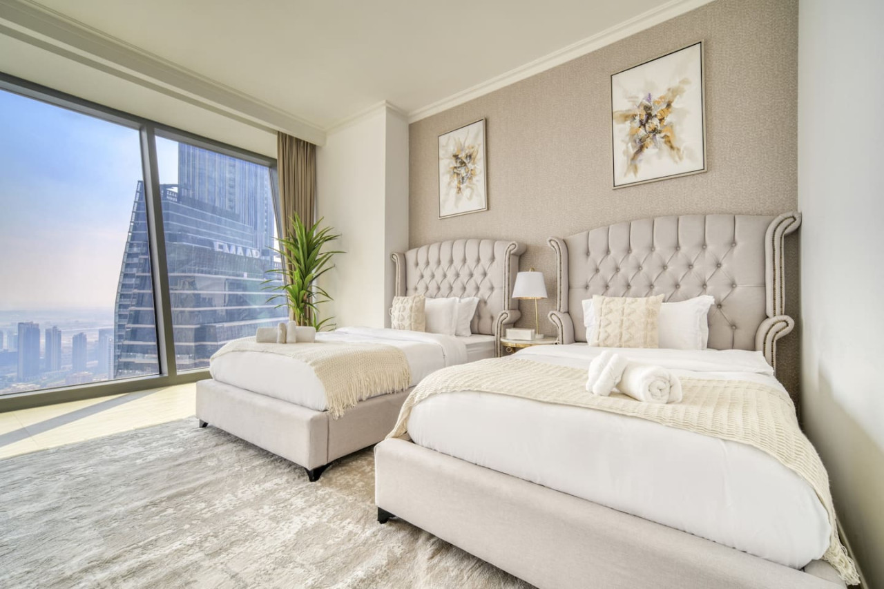 Step into a bohemian-inspired sanctuary in the heart of Downtown Dubai. This spacious three-bedroom plus maid’s room residence at Burj Vista offers breathtaking, uninterrupted views of the Burj Khalifa and The Dubai Fountain from every bedroom, creating a truly unique living experience. The interiors are thoughtfully designed with a modern bohemian theme, blending natural textures, warm earthy tones, and chic artisanal details. An open-plan living and dining area flows seamlessly onto a generous balcony, where you can enjoy panoramic cityscapes and evening fountain shows. Each bedroom features floor-to-ceiling windows, letting in abundant natural light and framing the skyline’s most iconic landmarks. The master suite includes a luxurious en-suite bathroom and ample wardrobe space, while the maid’s room adds practical flexibility for family or staff. Residents of Burj Vista enjoy world-class amenities, including a swimming pool, fully equipped gym, landscaped gardens, children’s play areas, and direct air-conditioned access to The Dubai Mall and Metro. Whether as a stylish family home or an exceptional investment in Dubai’s most prestigious address, this apartment captures the perfect balance of comfort, creativity, and unrivaled views.