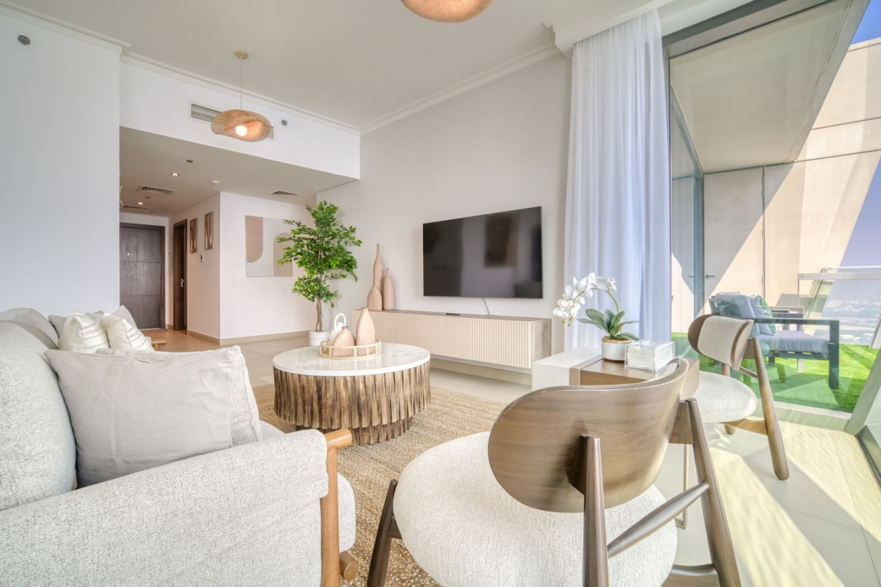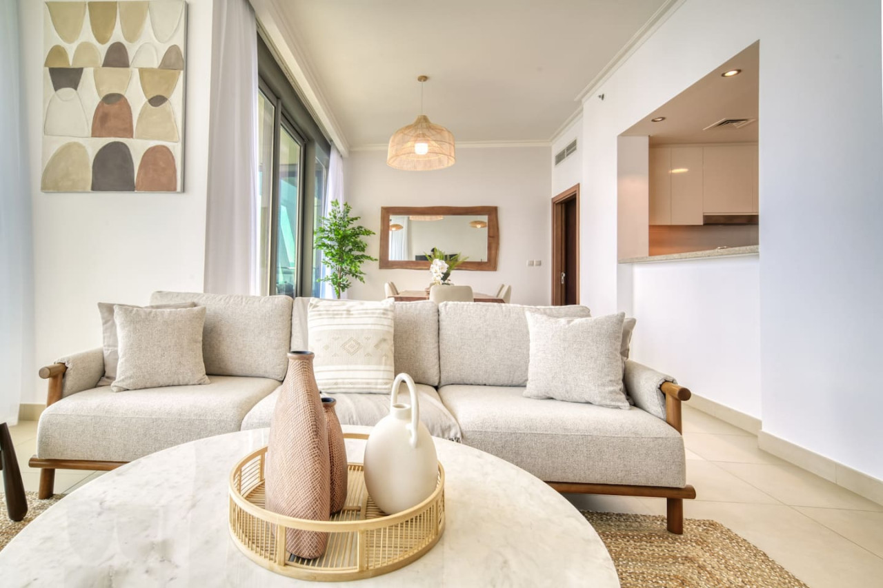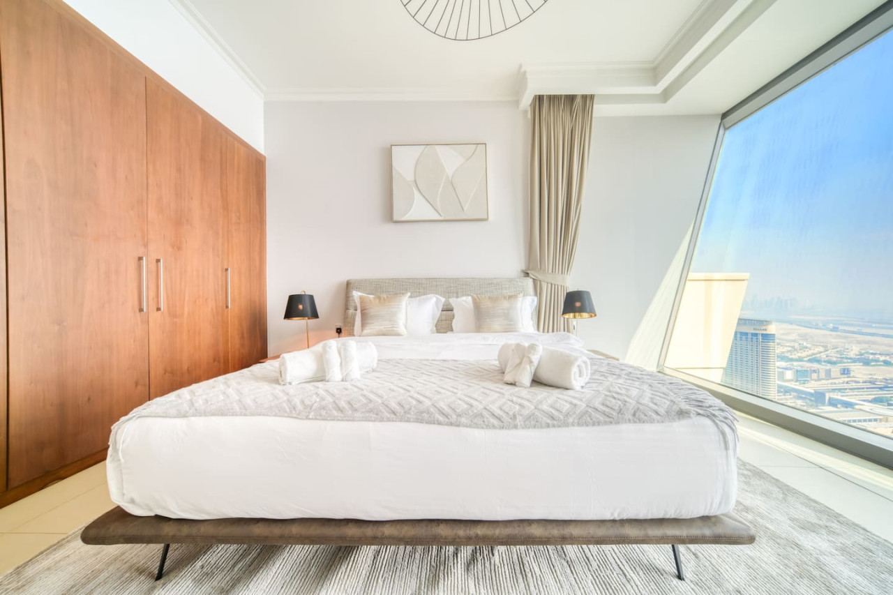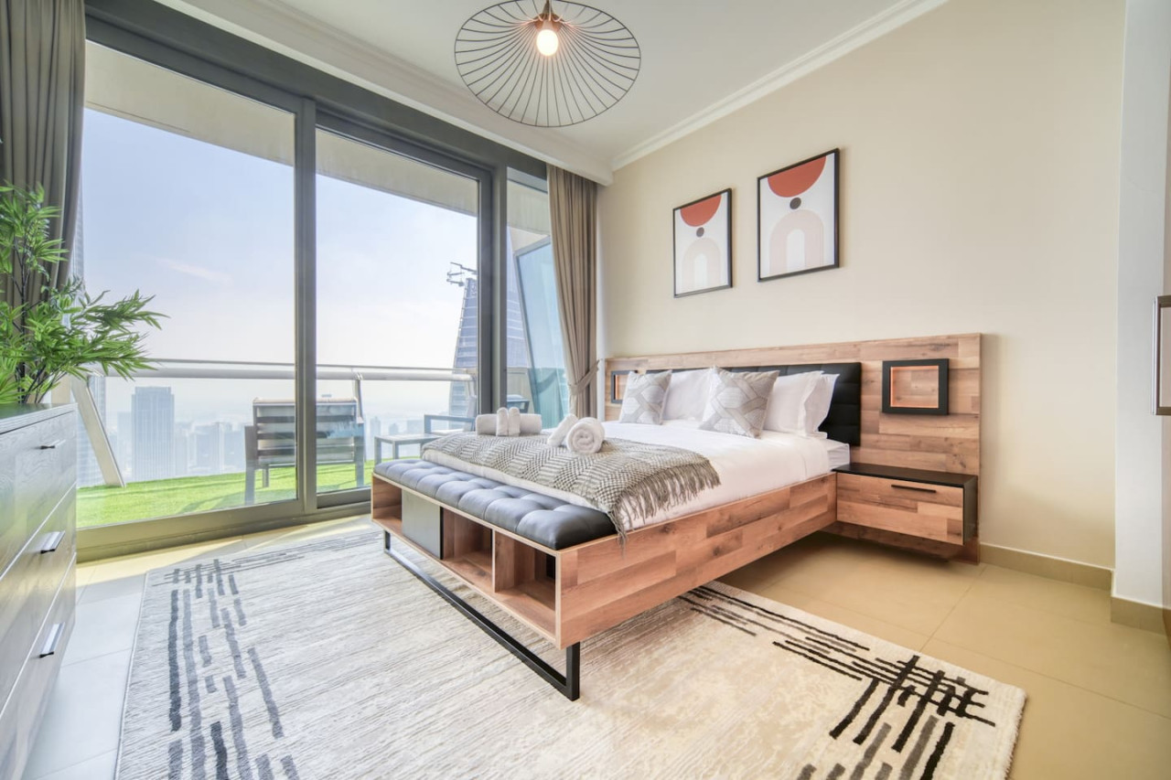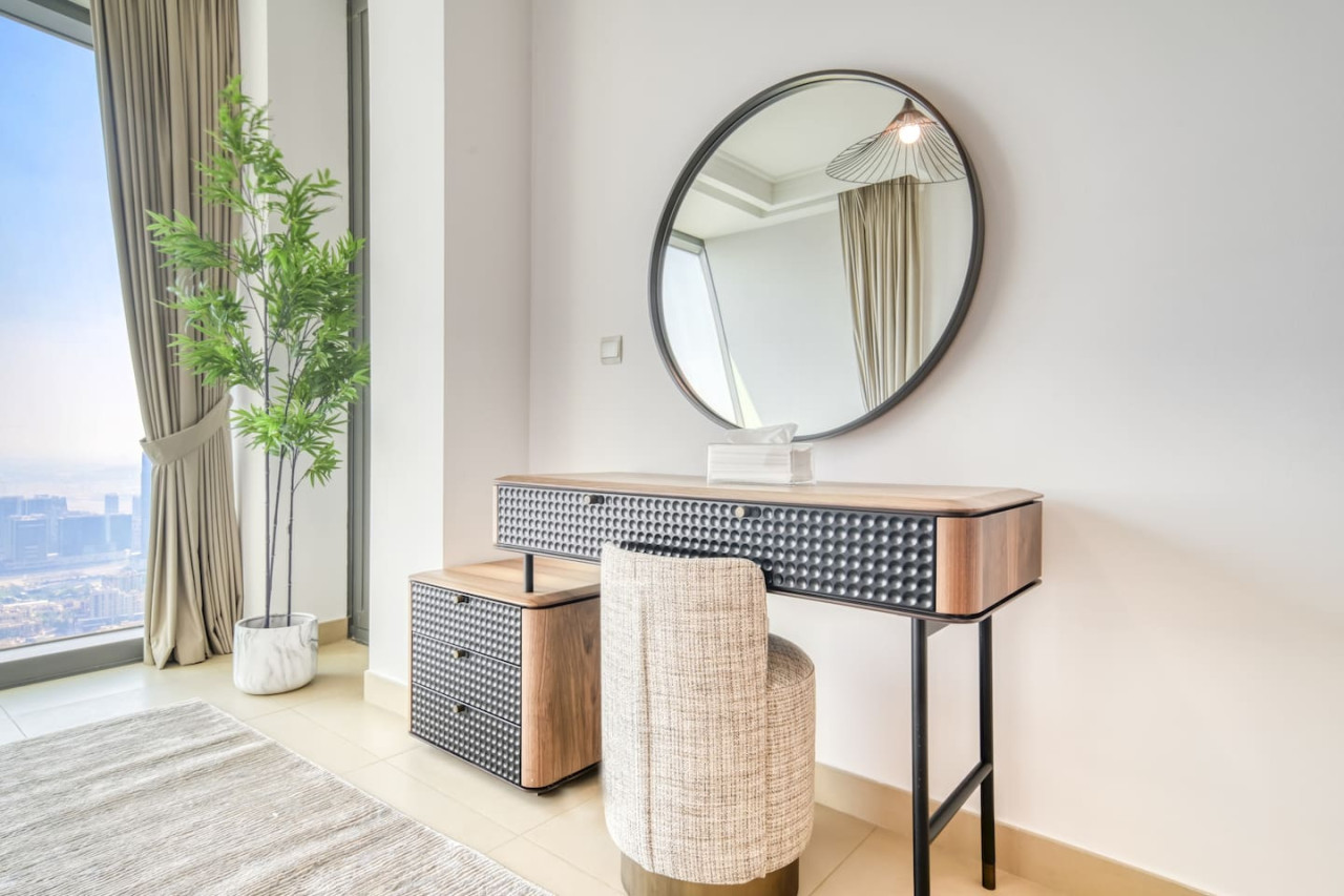 Step into a bohemian-inspired sanctuary in the heart of Downtown Dubai. This spacious three-bedroom plus maid’s room residence at Burj Vista offers breathtaking, uninterrupted views of the Burj Khalifa and The Dubai Fountain from every bedroom, creating a truly unique living experience. The interiors are thoughtfully designed with a modern bohemian theme, blending natural textures, warm earthy tones, and chic artisanal details. An open-plan living and dining area flows seamlessly onto a generous balcony, where you can enjoy panoramic cityscapes and evening fountain shows. Each bedroom features floor-to-ceiling windows, letting in abundant natural light and framing the skyline’s most iconic landmarks. The master suite includes a luxurious en-suite bathroom and ample wardrobe space, while the maid’s room adds practical flexibility for family or staff. Residents of Burj Vista enjoy world-class amenities, including a swimming pool, fully equipped gym, landscaped gardens, children’s play areas, and direct air-conditioned access to The Dubai Mall and Metro. Whether as a stylish family home or an exceptional investment in Dubai’s most prestigious address, this apartment captures the perfect balance of comfort, creativity, and unrivaled views.